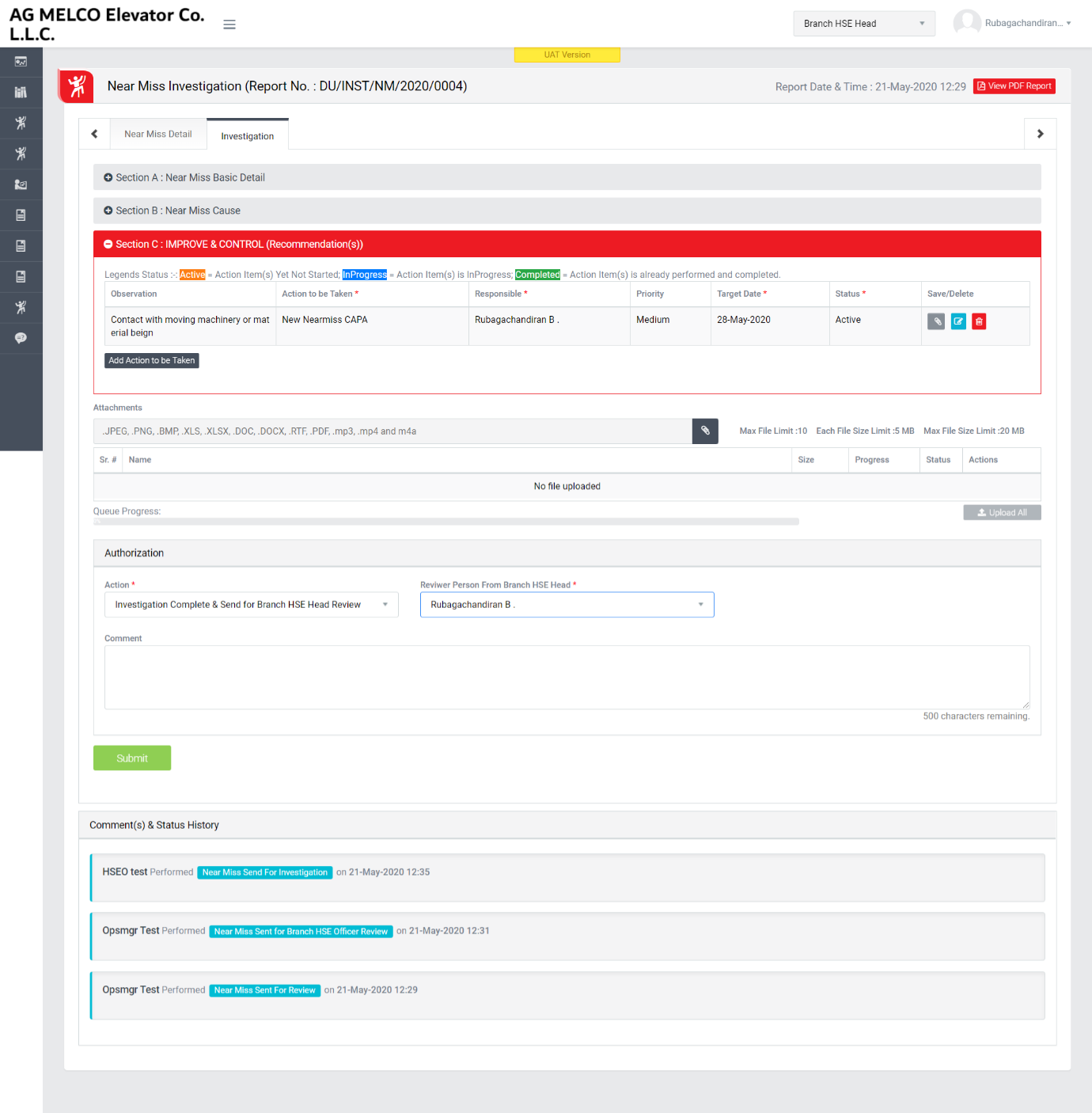 - Enter comments which is mandatory to enter if “Next Action” is selected as “Investigation Completed & Send for Branch HSE Head Review”. (If Next Action is selected and Save button is clicked task will be sent for review. Is Next Action is not selected and Save button is clicked then details will be saved).
