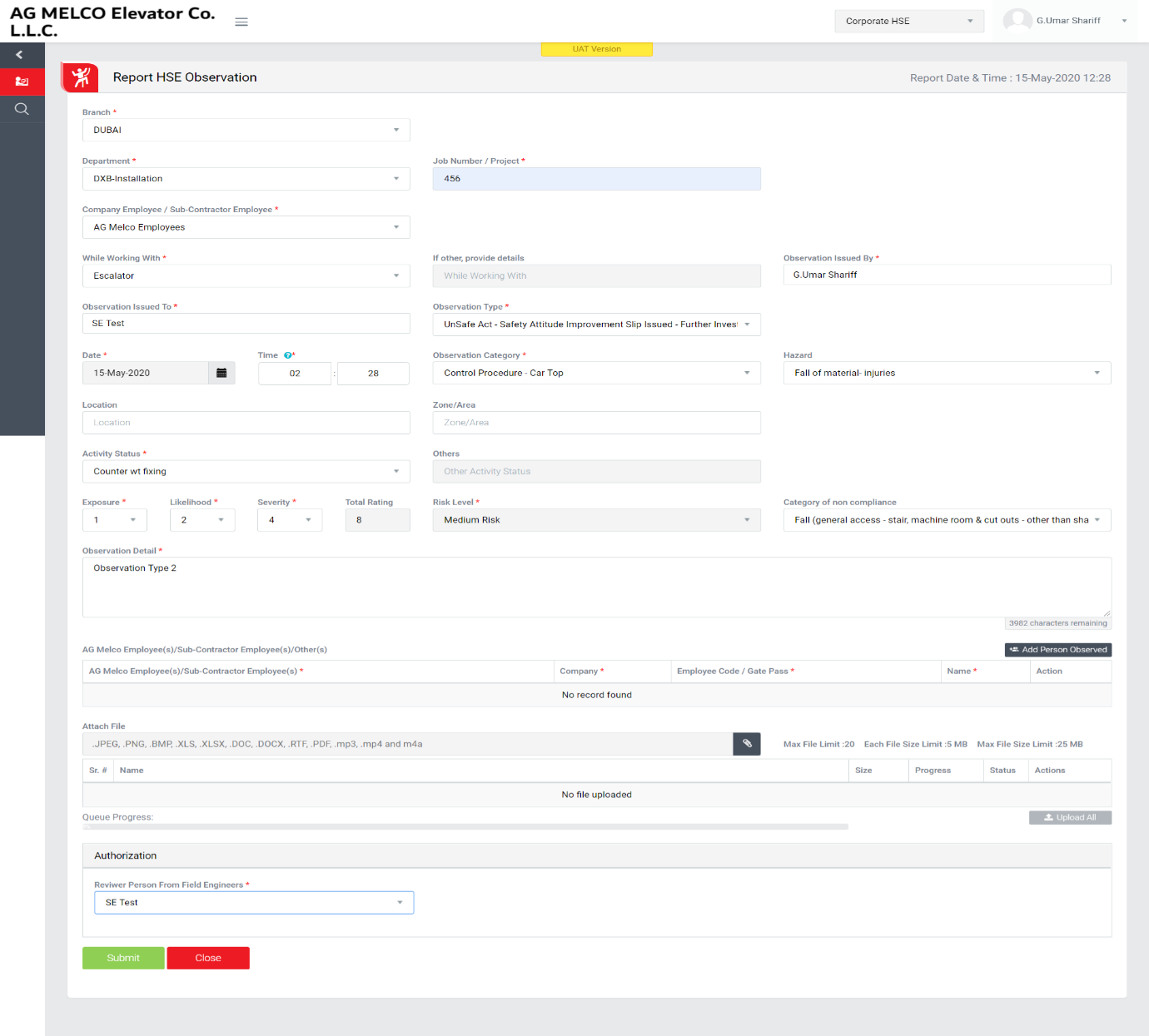 Objective: It allows user to create, review and approve/reject HSE Observation in the system. All the roles in the system can create HSE Observation.